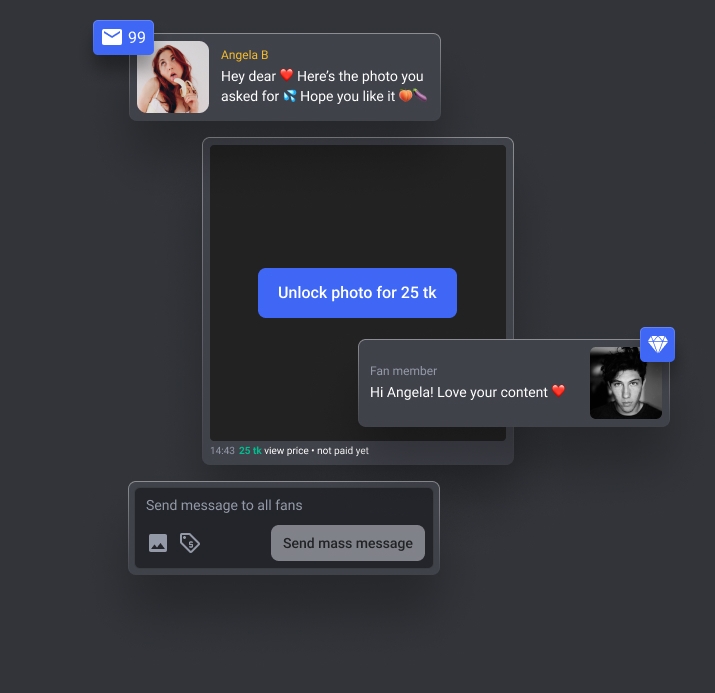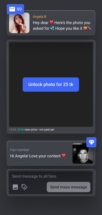 • Mass message fans! Whether you have amazingly hot new content coming up, or just want to wish them all a nice day, you will be able to reach all your fans at once! Privately and conveniently!